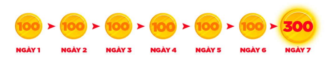 • Đăng nhập mỗi ngày nhận 100 Xu và liên tiếp 7 ngày nhận 300 Xu vào ngày thứ 7