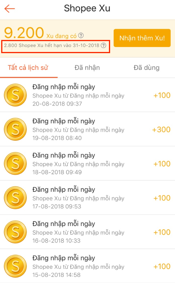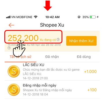 Trong trang Shopee Xu bạn cũng có thể xem lịch sử đã nhận/đã dùng Xu bằng cách nhấn vào số dư Shopee Xu: