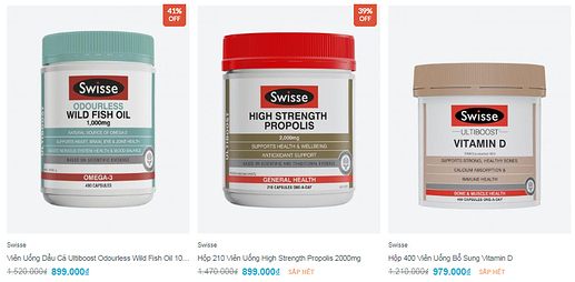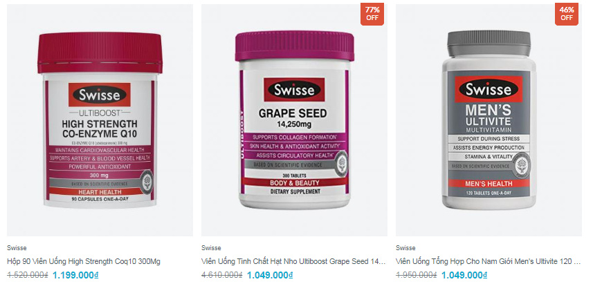 – Swisse – hãng thực phẩm chức năng đến từ Úc – giảm đến 78% toàn bộ sản phẩm, từ sản phẩm viên dầu cá, bổ sung vitamin D, kẽm, magie, canxi, vv…