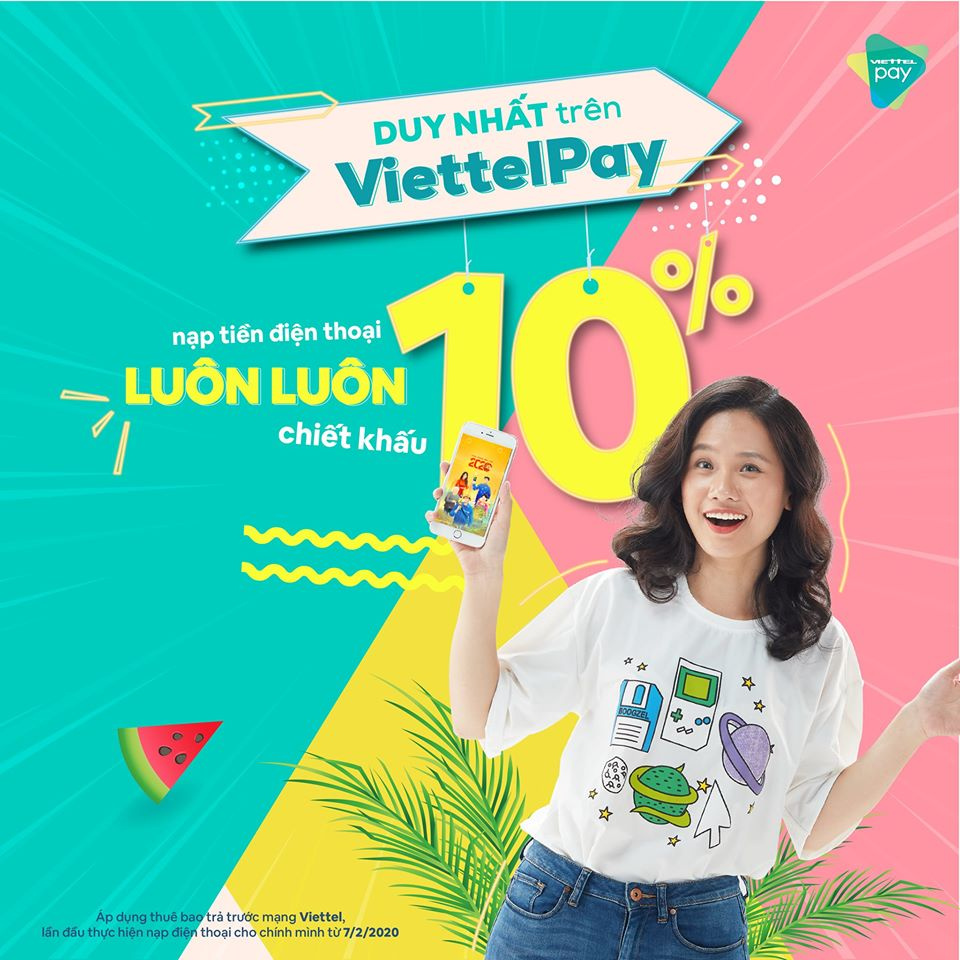 Chiết khấu ngay 10% giá trị giao dịch khi Khách hàng thực hiện nạp tiền điện thoại cho chính mình (mạng Viettel) qua ViettelPay.