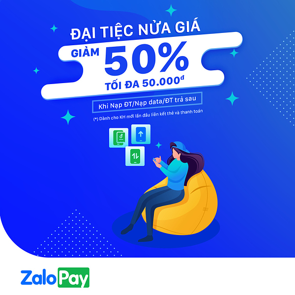 Giảm ngay 50% tối đa 50.000đ khi thanh toán 1 trong 3 dịch vụ Nạp điện thoại/Nạp data 3G&4G/Nạp ĐT trả sau