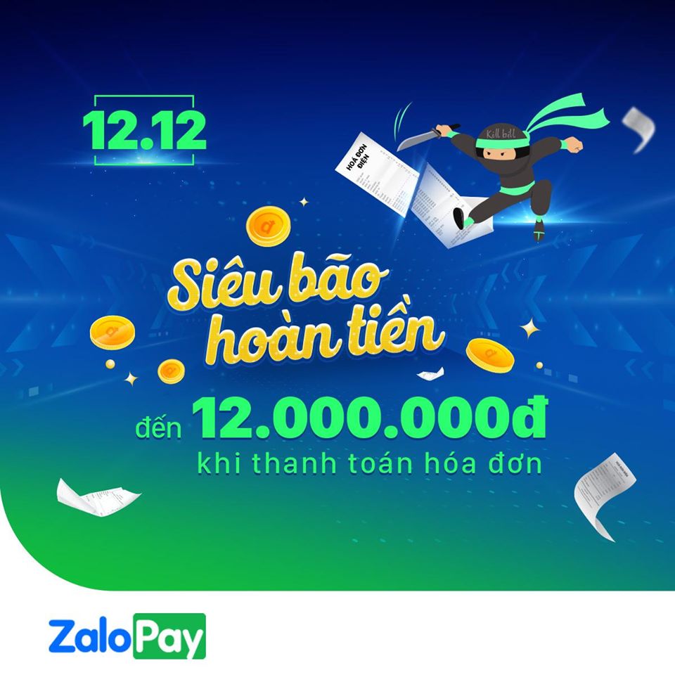 Duy nhất trong 12.12, zalopay ưu đãi thanh toán 1 trong 4 loại hóa đơn Điện/Nước/Truyền hình/Internet, có ngay cơ hội nhận hoàn tiền lên đến 12.000.000đ.